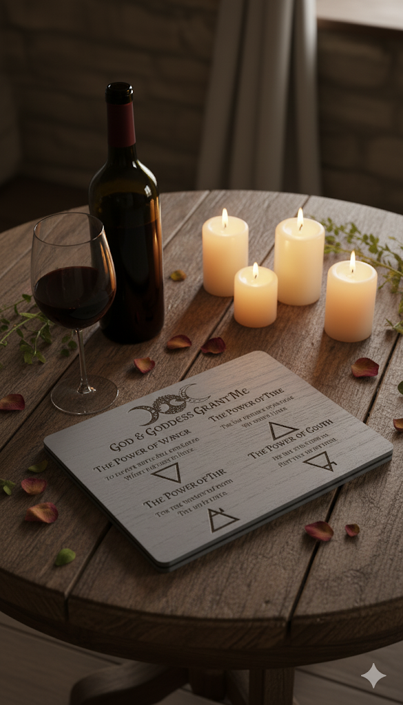 Crafted from a solid, smooth wood, this plaque features a powerful and elegant design. At the top, the Triple Moon Goddess symbol sits alongside a symbol for the God, representing the balance of the masculine and feminine divine. Below, a moving prayer to the God and Goddess is etched, invoking the power of the four classical elements: