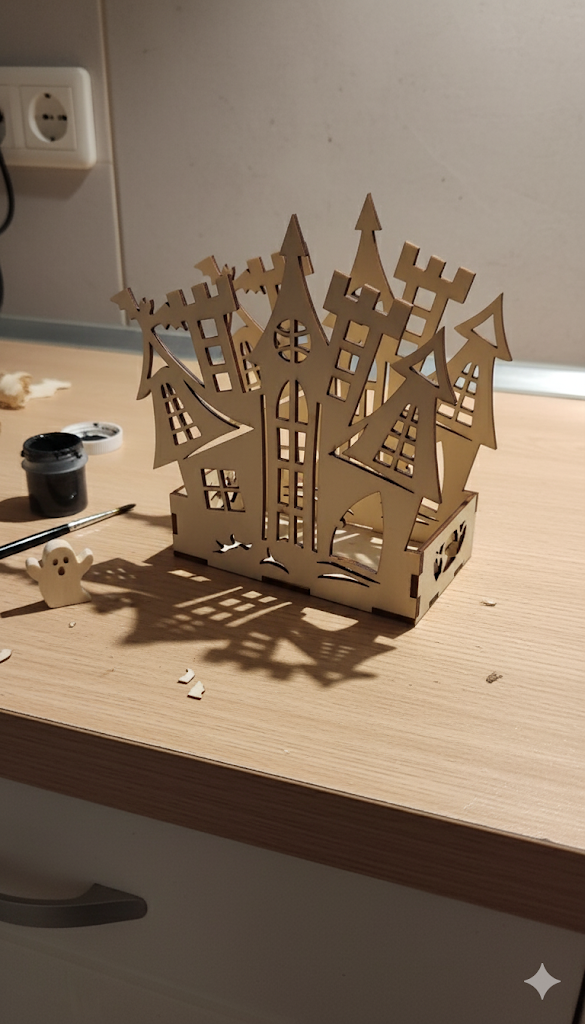 Design: Intricate laser-cut haunted house silhouette